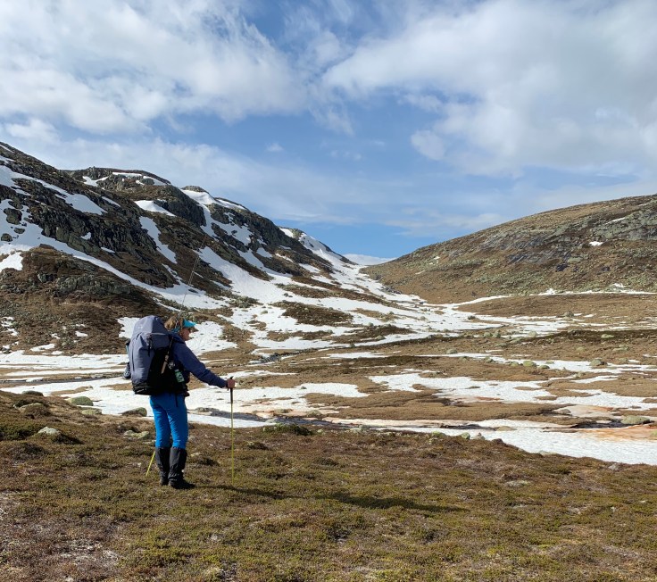 På vei østover og ned Hisdalen mot Bykle nå. Det var mye mer snø vestover – noe som kunne vært et alternativ. Kursen er selvfølgelig mot nord, men rutene svinger litt i andre retninger også.