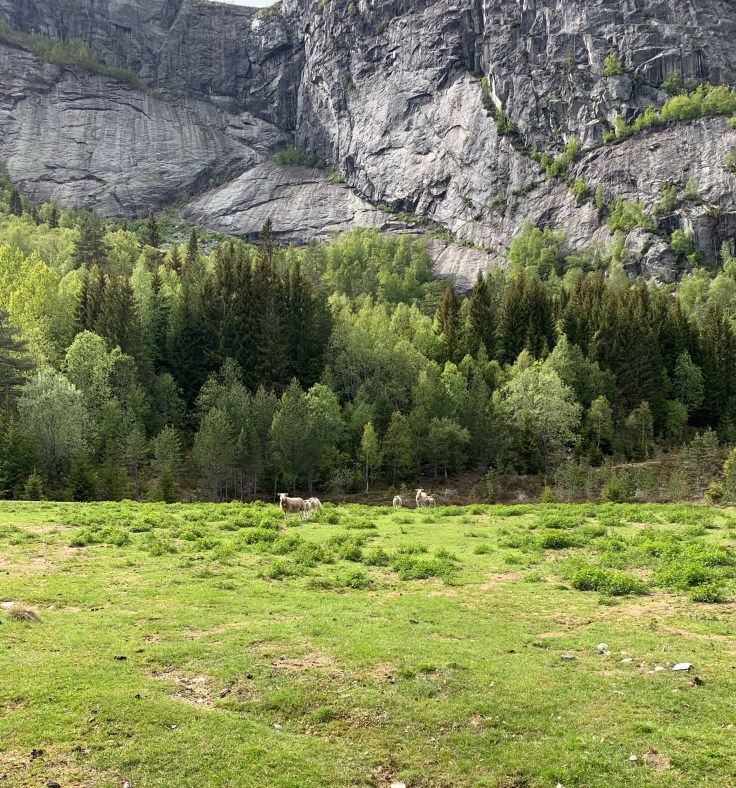 Det er mange trær i dette landet – og de er grønne! Se godt etter – for det er så utrolig mange nyanser av grønt. Det er forresten min yndlingsfarge! Mange sauer er det også. Vi synes de svarte sauene er finest!