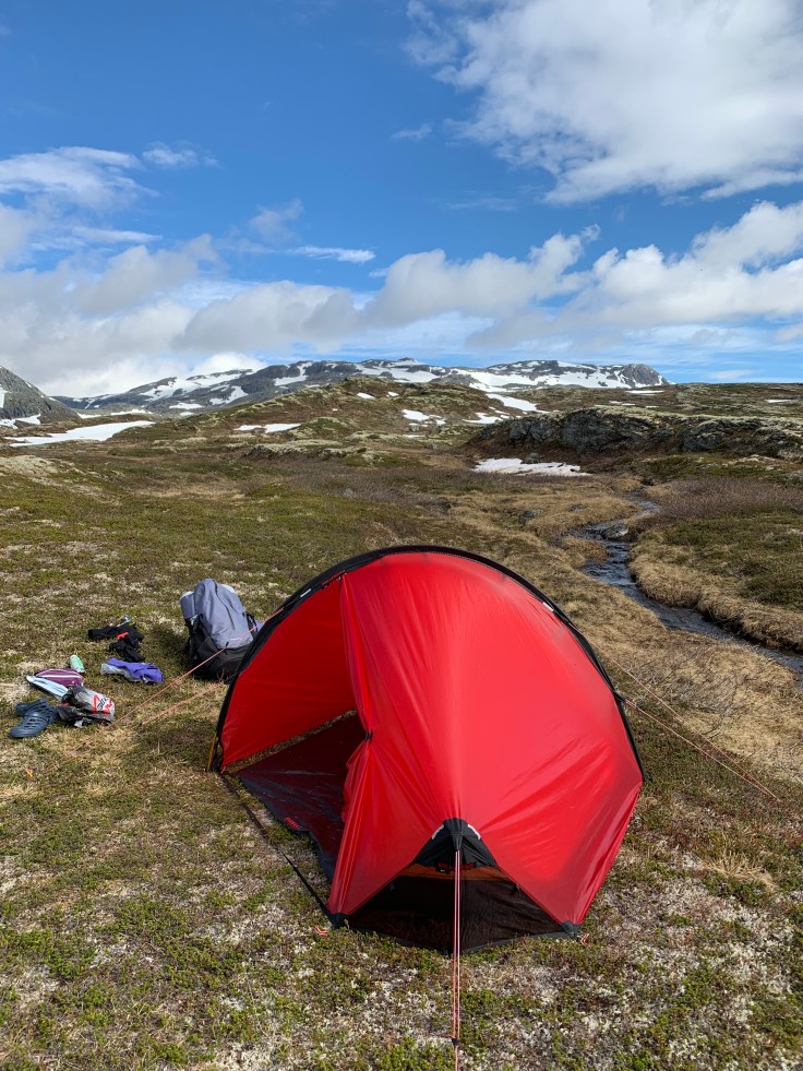 Klar for Jotunheimen etter å ha teltet ved Tyin.