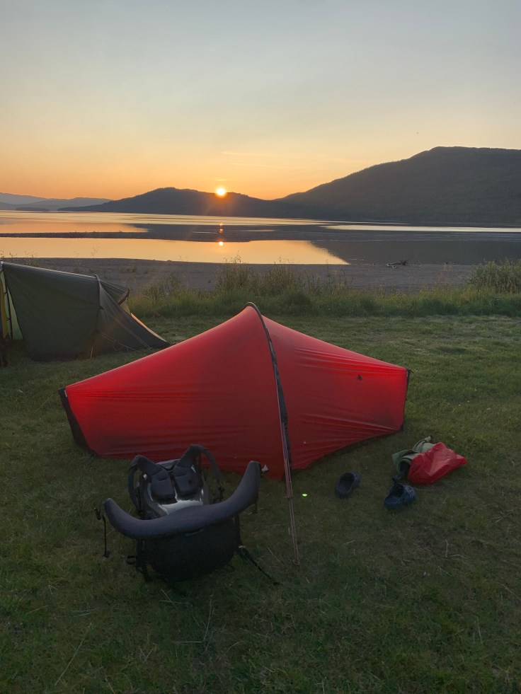 Som bildet over viser, er det ikke vanskelig å rote selv om en er ute. Sovepose må luftes, det var utrolig fuktig her i natt. Solcelleanlegget lader opp powerbank. Kart studeres mens kaffen inntas. Føttene har fått en liten «mini-spa» (det var nok å overdrive litt) og havregrøten står til koking.
